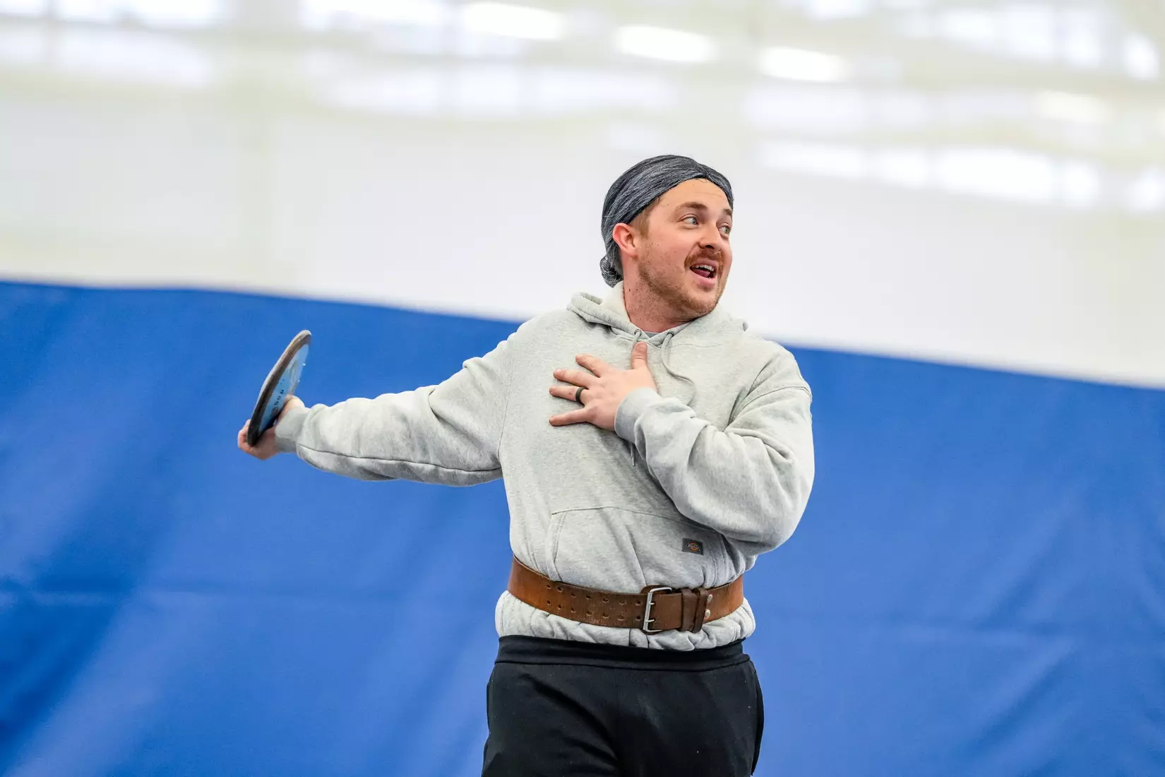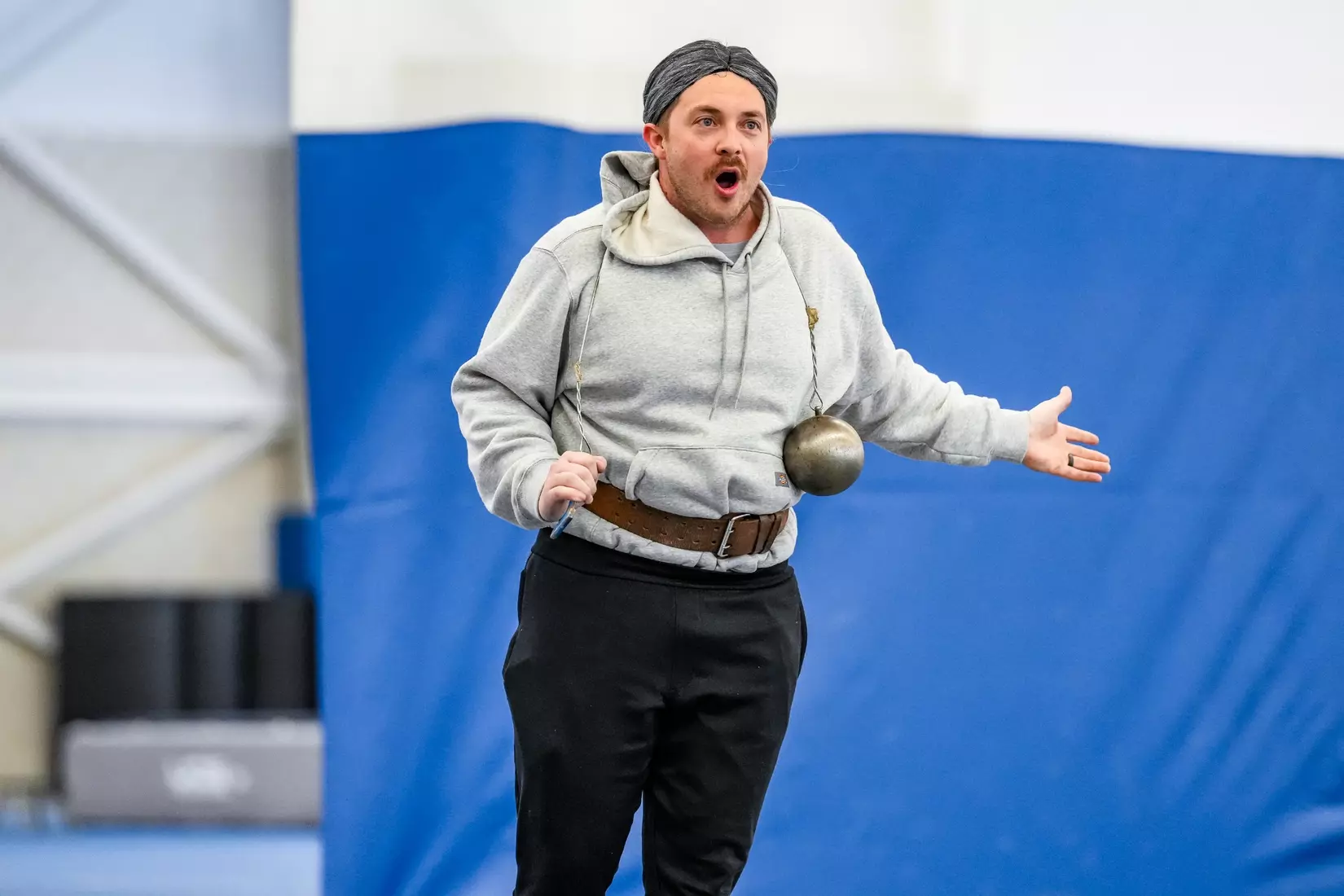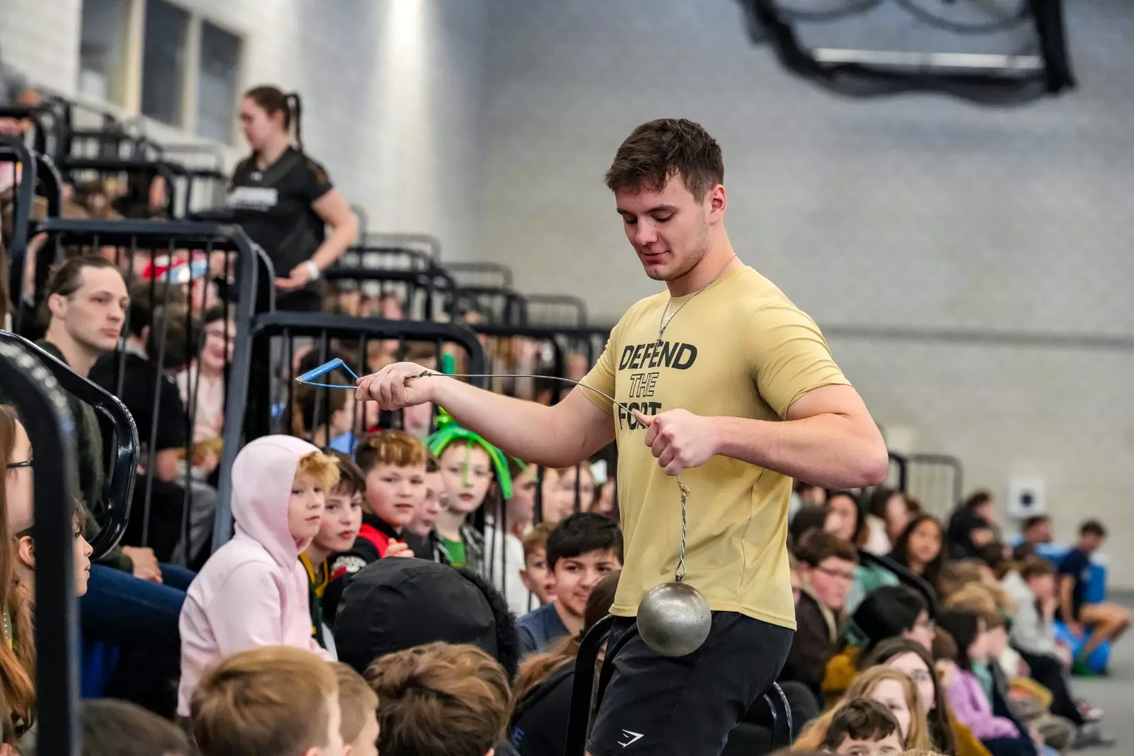 Students arrived on buses on Monday and Tuesday and filled the bleachers of the Lutheran Health Fieldhouse. They were not treated to chocolate cake. Instead Purdue Fort Wayne throws coach Sean Magnuson, dressed as Miss Trunchbull, taught the elementary school students about the shot put, discus, javelin, hammer and weight throw. Mastodon student-athletes demonstrated each throw for the kids. The 30-minute session was capped with Miss Trunchbull herself taking a turn. Have no fear, no children were thrown by their pigtails in the demonstration.